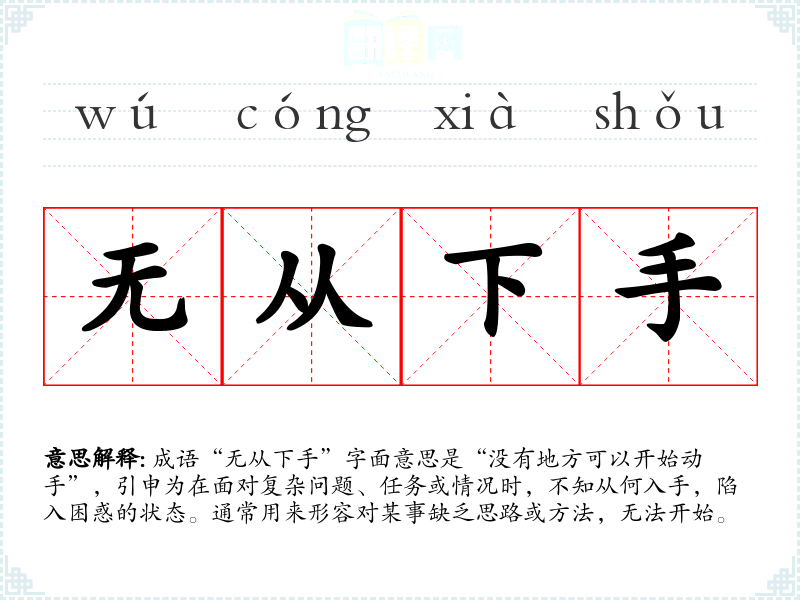 “无从下手”的具体来源较为模糊,但其结构和用法在古代文献中有所体现。成语中的“无从”意为“没有途径”或“没有地方”,而“下手”则是指开始动手做某事。该成语的形成可能与古人处理复杂事务时的心理状态有关,反映出对困难情境的无奈与困惑。