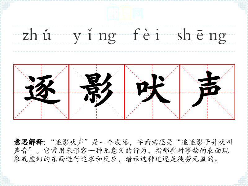 “逐影吠声”是一个成语,字面意思是“追逐影子并吠叫声音”。它常用来形容一种无意义的行为,指那些对事物的表面现象或虚幻的东西进行追求和反应,暗示这种追逐是徒劳无益的。