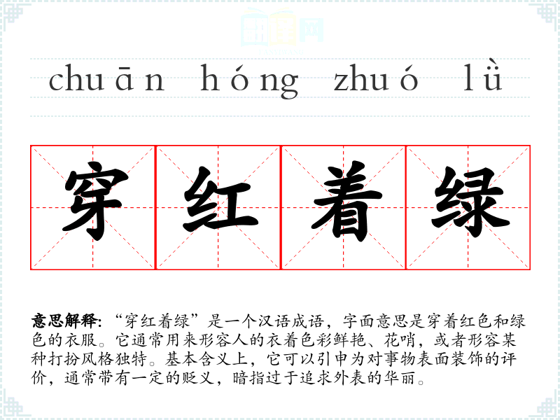 “穿红着绿”是一个汉语成语,字面意思是穿着红色和绿色的衣服。它通常用来形容人的衣着色彩鲜艳、花哨,或者形容某种打扮风格独特。基本含义上,它可以引申为对事物表面装饰的评价,通常带有一定的贬义,暗指过于追求外表的华丽。