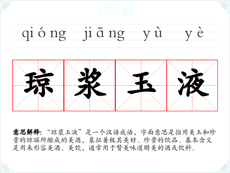 “琼浆玉液”是一个汉语成语,字面意思是指用美玉和珍贵的琼瑶所酿成的美酒,象征着极其美好、珍贵的饮品。基本含义是用来形容美酒、美饮,通常用于赞美味道醇美的酒或饮料。