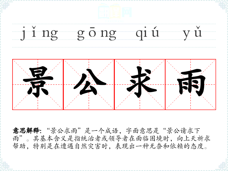该成语源于**春秋时期的历史典故。景公是春秋时期晋国的国君,他在位时曾因干旱而请求上天降雨。这个典故反映了古代统治者在面对自然环境时的无能为力,也揭示了人们对于自然力量的敬畏和依赖。这一历史背景赋予了成语更深层的含义,传达出对自然力量的尊重。