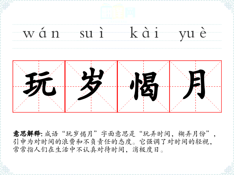 成语“玩岁愒月”字面意思是“玩弄时间,糊弄月份”,引申为对时间的浪费和不负责任的态度。它强调了对时间的轻视,常常指人们在生活中不认真对待时间,消极度日。