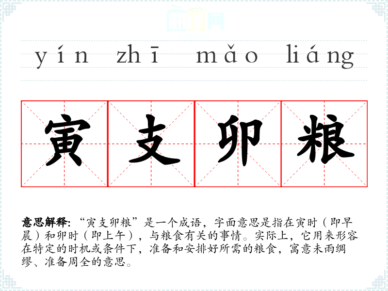“寅支卯粮”是一个成语,字面意思是指在寅时(即早晨)和卯时(即上午),与粮食有关的事情。实际上,它用来形容在特定的时机或条件下,准备和安排好所需的粮食,寓意未雨绸缪、准备周全的意思。