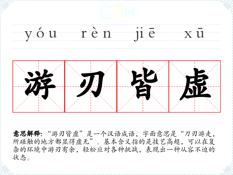 - 日常对话:可以用于形容某人在工作或生活中的应对能力,比如“他处理这项复杂的项目时游刃皆虚”。