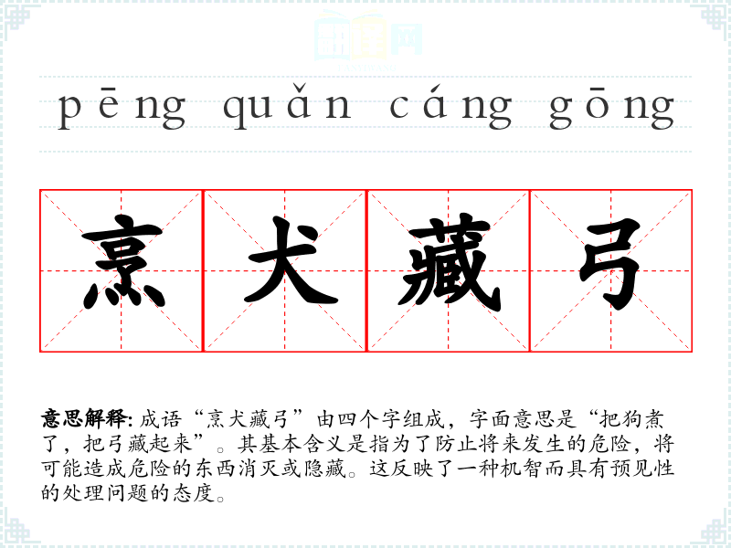 成语“烹犬藏弓”由四个字组成,字面意思是“把狗煮了,把弓藏起来”。其基本含义是指为了防止将来发生的危险,将可能造成危险的东西消灭或隐藏。这反映了一种机智而具有预见性的处理问题的态度。