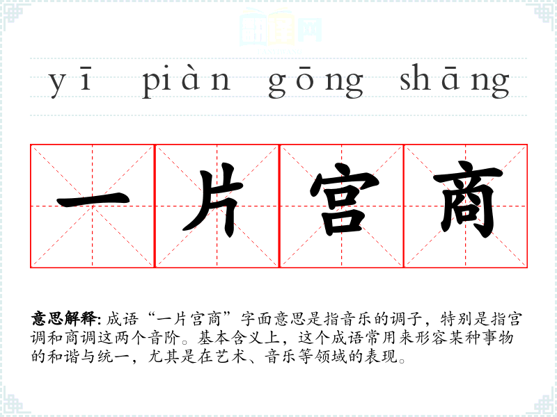 成语“一片宫商”字面意思是指音乐的调子,特别是指宫调和商调这两个音阶。基本含义上,这个成语常用来形容某种事物的和谐与统一,尤其是在艺术、音乐等领域的表现。