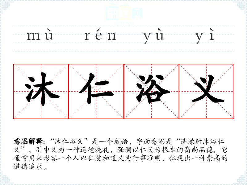 “沐仁浴义”是一个成语,字面意思是“洗澡时沐浴仁义”,引申义为一种道德洗礼,强调以仁义为根本的高尚品德。它通常用来形容一个人以仁爱和道义为行事准则,体现出一种崇高的道德追求。