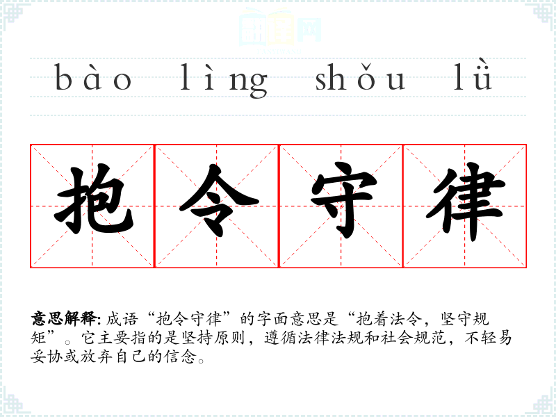 成语“抱令守律”的字面意思是“抱着法令,坚守规矩”。它主要指的是坚持原则,遵循法律法规和社会规范,不轻易妥协或放弃自己的信念。