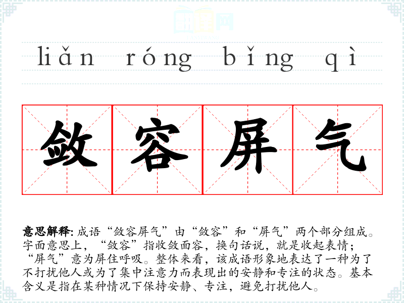 成语“敛容屏气”由“敛容”和“屏气”两个部分组成。字面意思上,“敛容”指收敛面容,换句话说,就是收起表情;“屏气”意为屏住呼吸。整体来看,该成语形象地表达了一种为了不打扰他人或为了集中注意力而表现出的安静和专注的状态。基本含义是指在某种情况下保持安静、专注,避免打扰他人。