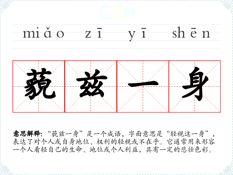 “藐兹一身”是一个成语,字面意思是“轻视这一身”,表达了对个人或自身地位、权利的轻视或不在乎。它通常用来形容一个人看轻自己的生命、地位或个人利益,具有一定的悲壮色彩。