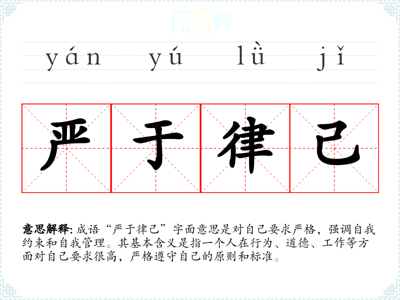 成语“严于律己”字面意思是对自己要求严格,强调自我约束和自我管理。其基本含义是指一个人在行为、道德、工作等方面对自己要求很高,严格遵守自己的原则和标准。