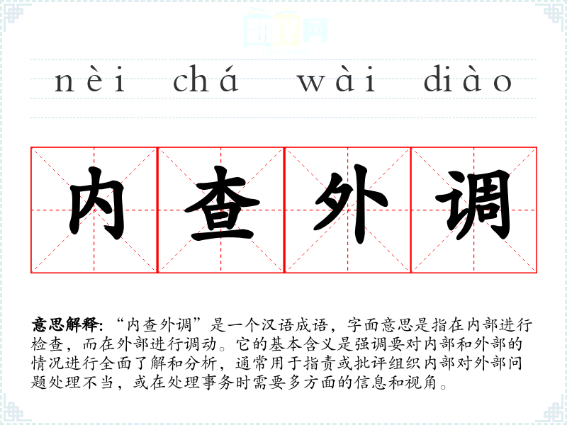 “内查外调”是一个汉语成语,字面意思是指在内部进行检查,而在外部进行调动。它的基本含义是强调要对内部和外部的情况进行全面了解和分析,通常用于指责或批评组织内部对外部问题处理不当,或在处理事务时需要多方面的信息和视角。