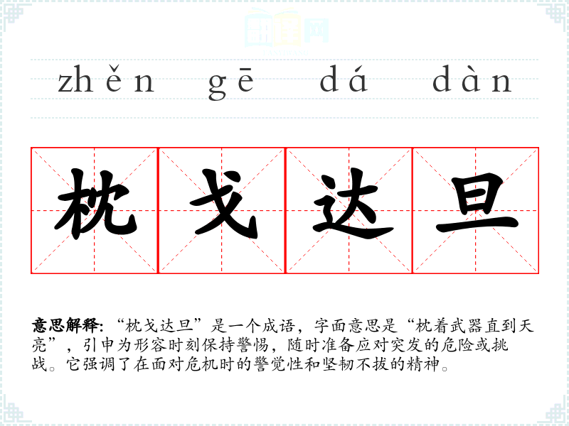 “枕戈达旦”是一个成语,字面意思是“枕着武器直到天亮”,引申为形容时刻保持警惕,随时准备应对突发的危险或挑战。它强调了在面对危机时的警觉性和坚韧不拔的精神。
