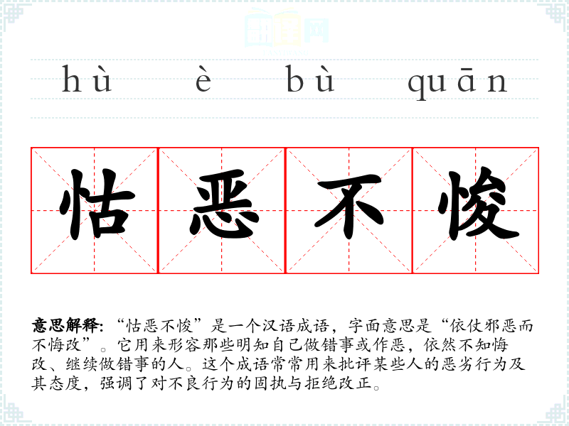 “怙恶不悛”是一个汉语成语,字面意思是“依仗邪恶而不悔改”。它用来形容那些明知自己做错事或作恶,依然不知悔改、继续做错事的人。这个成语常常用来批评某些人的恶劣行为及其态度,强调了对不良行为的固执与拒绝改正。