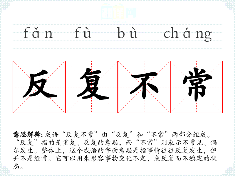 成语“反复不常”由“反复”和“不常”两部分组成。“反复”指的是重复、反复的意思,而“不常”则表示不常见、偶尔发生。整体上,这个成语的字面意思是指事情往往反复发生,但并不是经常。它可以用来形容事物变化不定,或反复而不稳定的状态。