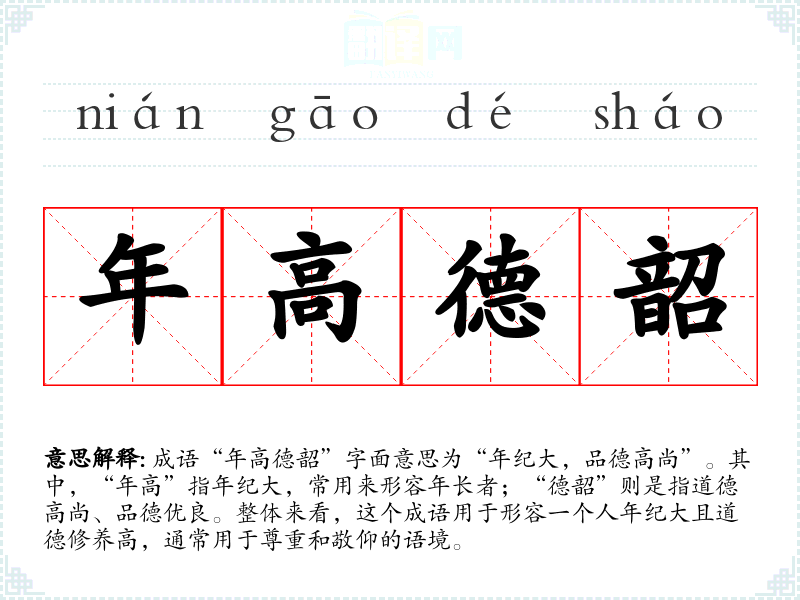 在**文化中,尊重长辈、尊重道德是重要的价值观。因此,“年高德韶”不仅是对个人的赞美,也是对传统文化的认同。在现代社会,这个成语依然适用,尤其在强调道德和品德教育的背景下。