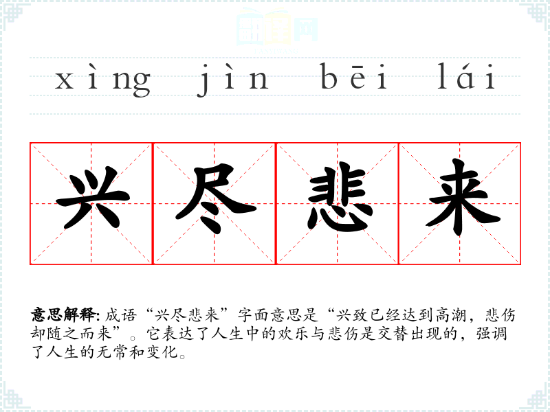 成语“兴尽悲来”字面意思是“兴致已经达到高潮,悲伤却随之而来”。它表达了人生中的欢乐与悲伤是交替出现的,强调了人生的无常和变化。