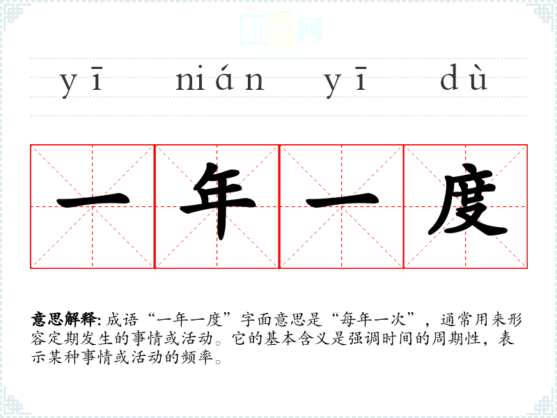 成语“一年一度”字面意思是“每年一次”,通常用来形容定期发生的事情或活动。它的基本含义是强调时间的周期性,表示某种事情或活动的频率。