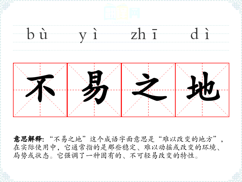 “不易之地”这个成语字面意思是“难以改变的地方”,在实际使用中,它通常指的是那些稳定、难以动摇或改变的环境、局势或状态。它强调了一种固有的、不可轻易改变的特性。
