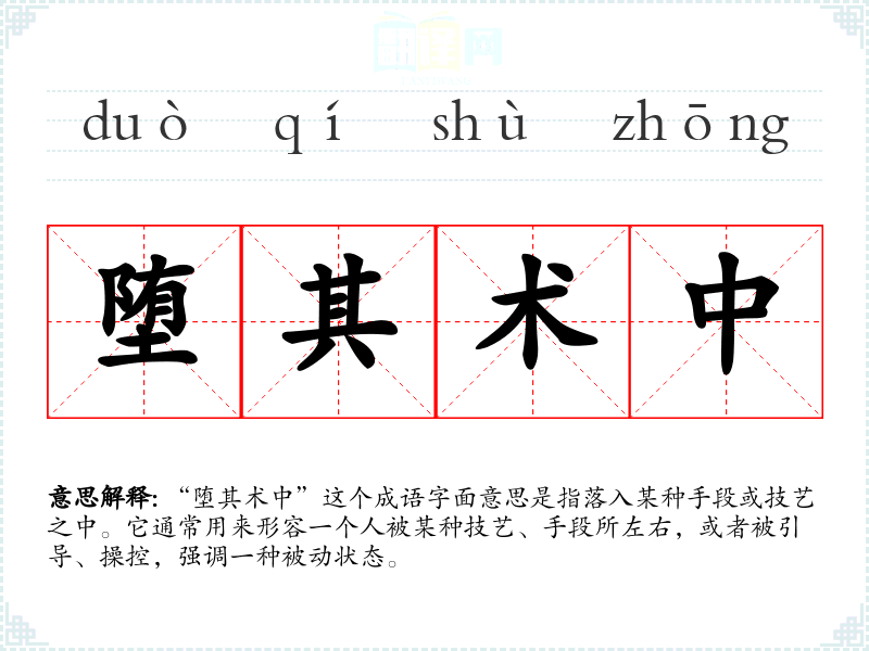 “堕其术中”这个成语字面意思是指落入某种手段或技艺之中。它通常用来形容一个人被某种技艺、手段所左右,或者被引导、操控,强调一种被动状态。