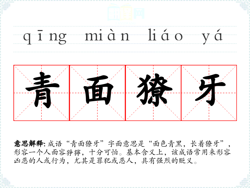 成语“青面獠牙”字面意思是“面色青黑,长着獠牙”,形容一个人面容猙獰,十分可怕。基本含义上,该成语常用来形容凶恶的人或行为,尤其是罪犯或恶人,具有强烈的贬义。