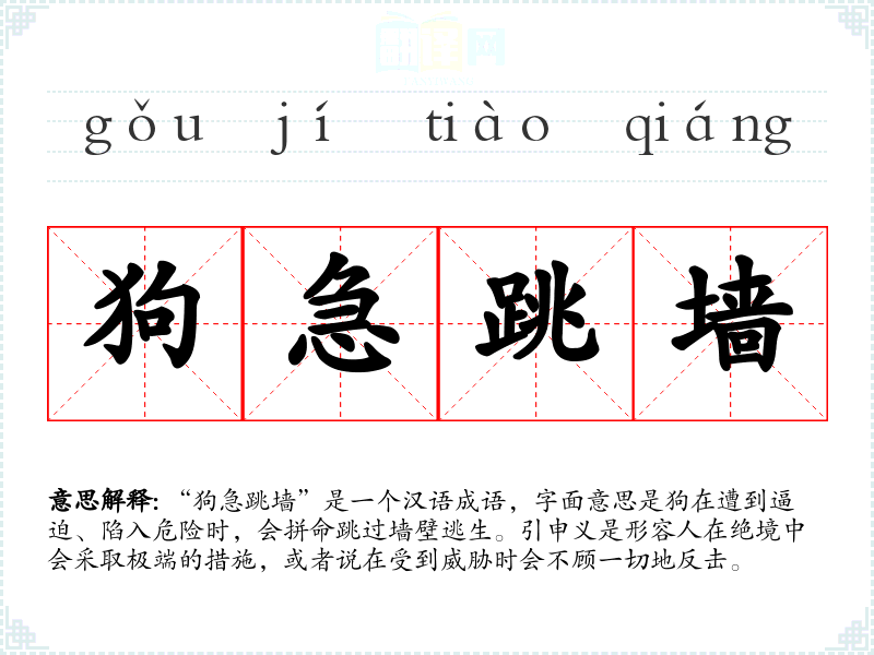 “狗急跳墙”是一个汉语成语,字面意思是狗在遭到逼迫、陷入危险时,会拼命跳过墙壁逃生。引申义是形容人在绝境中会采取极端的措施,或者说在受到威胁时会不顾一切地反击。