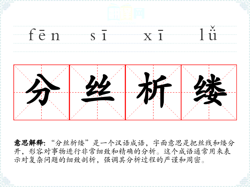 “分丝析缕”是一个汉语成语,字面意思是把丝线和缕分开,形容对事物进行非常细致和精确的分析。这个成语通常用来表示对复杂问题的细致剖析,强调其分析过程的严谨和周密。
