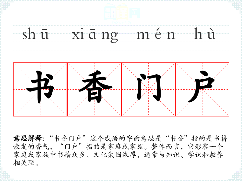 “书香门户”这个成语的字面意思是“书香”指的是书籍散发的香气,“门户”指的是家庭或家族。整体而言,它形容一个家庭或家族中书籍众多、文化氛围浓厚,通常与知识、学识和教养相关联。