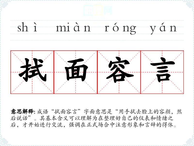 成语“拭面容言”字面意思是“用手拭去脸上的容颜,然后说话”。其基本含义可以理解为在整理好自己的仪表和情绪之后,才开始进行交流,强调在正式场合中注意形象和言辞的得体。