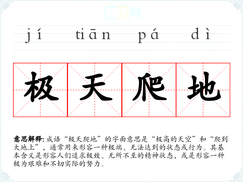 成语“极天爬地”的字面意思是“极高的天空”和“爬到大地上”,通常用来形容一种极端、无法达到的状态或行为。其基本含义是形容人们追求极致、无所不至的精神状态,或是形容一种极为艰难和不切实际的努力。