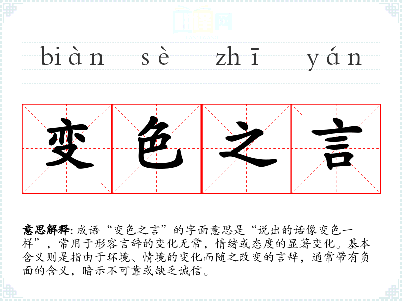 成语“变色之言”的字面意思是“说出的话像变色一样”,常用于形容言辞的变化无常,情绪或态度的显著变化。基本含义则是指由于环境、情境的变化而随之改变的言辞,通常带有负面的含义,暗示不可靠或缺乏诚信。