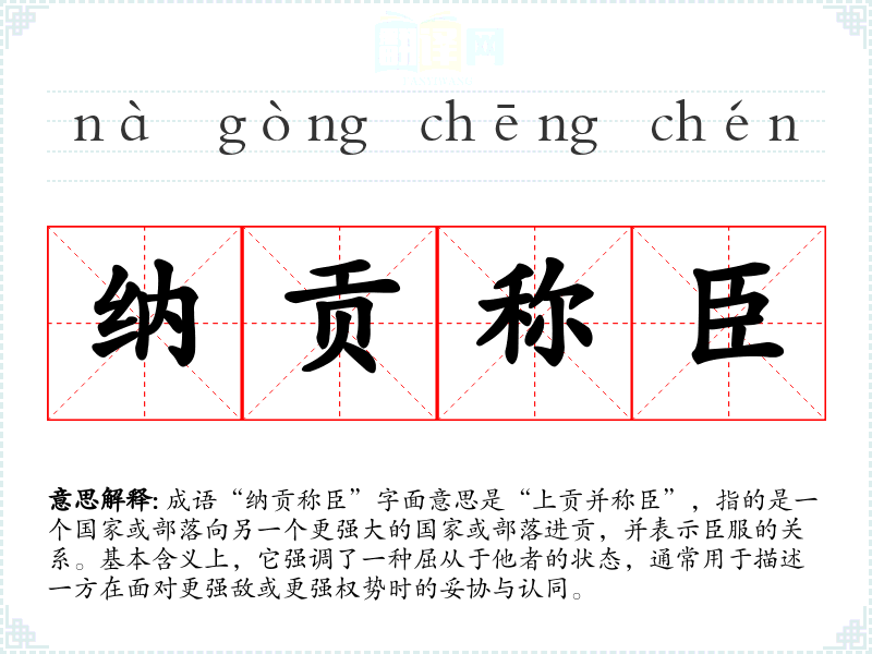 成语“纳贡称臣”字面意思是“上贡并称臣”,指的是一个国家或部落向另一个更强大的国家或部落进贡,并表示臣服的关系。基本含义上,它强调了一种屈从于他者的状态,通常用于描述一方在面对更强敌或更强权势时的妥协与认同。