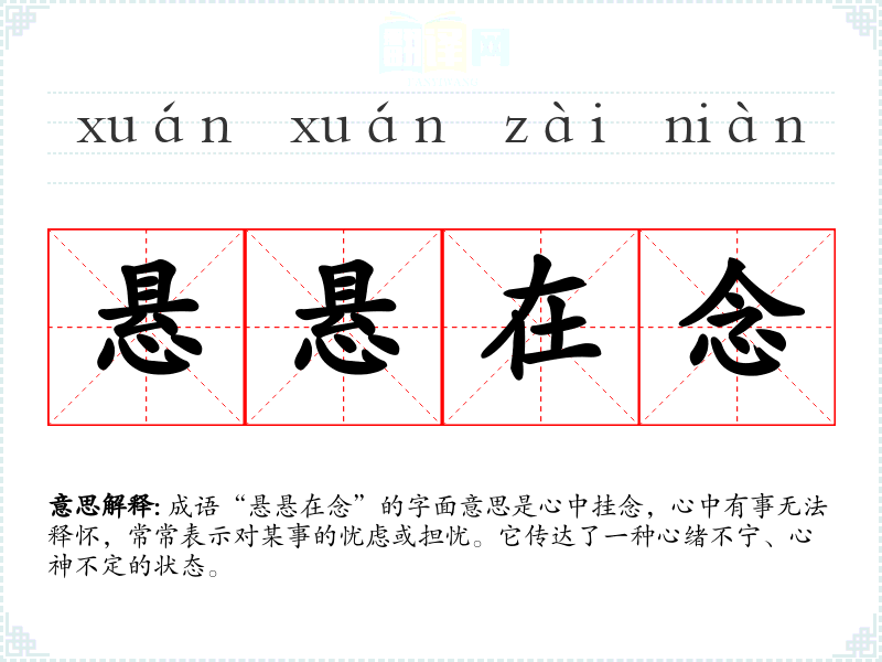 成语“悬悬在念”的字面意思是心中挂念,心中有事无法释怀,常常表示对某事的忧虑或担忧。它传达了一种心绪不宁、心神不定的状态。