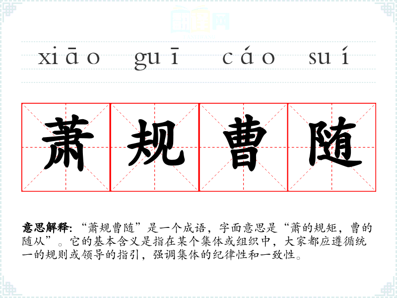 “萧规曹随”是一个成语,字面意思是“萧的规矩,曹的随从”。它的基本含义是指在某个集体或组织中,大家都应遵循统一的规则或领导的指引,强调集体的纪律性和一致性。