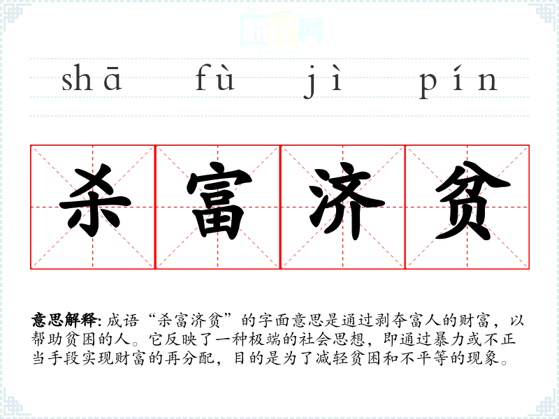 成语“杀富济贫”的字面意思是通过剥夺富人的财富,以帮助贫困的人。它反映了一种极端的社会思想,即通过暴力或不正当手段实现财富的再分配,目的是为了减轻贫困和不平等的现象。