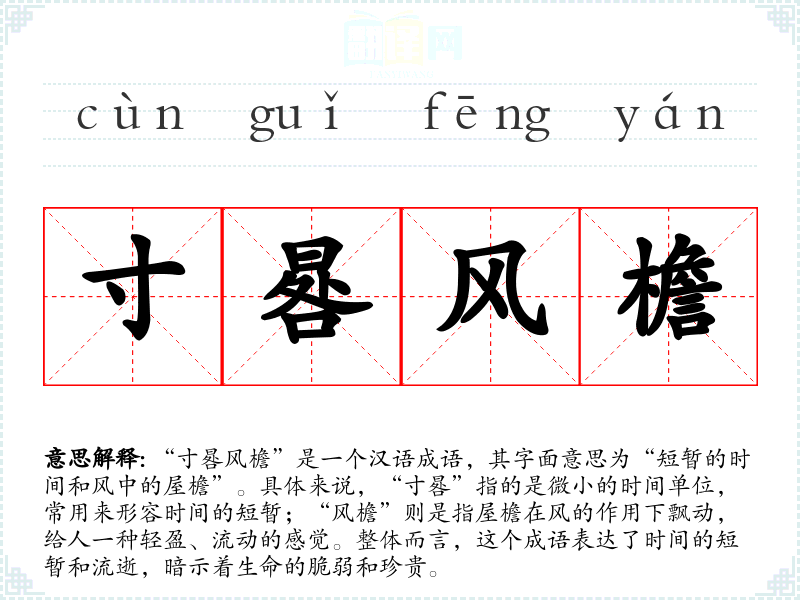 “寸晷风檐”是一个汉语成语,其字面意思为“短暂的时间和风中的屋檐”。具体来说,“寸晷”指的是微小的时间单位,常用来形容时间的短暂;“风檐”则是指屋檐在风的作用下飘动,给人一种轻盈、流动的感觉。整体而言,这个成语表达了时间的短暂和流逝,暗示着生命的脆弱和珍贵。