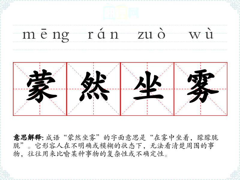 成语“蒙然坐雾”的字面意思是“在雾中坐着,朦朦胧胧”。它形容人在不明确或模糊的状态下,无法看清楚周围的事物,往往用来比喻某种事物的复杂性或不确定性。