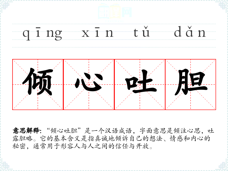 “倾心吐胆”是一个汉语成语,字面意思是倾注心思,吐露胆略。它的基本含义是指真诚地倾诉自己的想法、情感和内心的秘密,通常用于形容人与人之间的信任与开放。