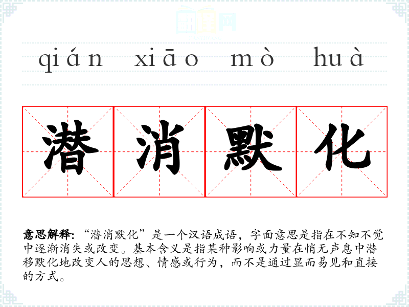 “潜消默化”是一个汉语成语,字面意思是指在不知不觉中逐渐消失或改变。基本含义是指某种影响或力量在悄无声息中潜移默化地改变人的思想、情感或行为,而不是通过显而易见和直接的方式。