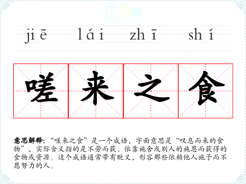 “嗟来之食”是一个成语,字面意思是“叹息而来的食物”,实际含义指的是不劳而获、依靠施舍或别人的施恩而获得的食物或资源。这个成语通常带有贬义,形容那些依赖他人施予而不愿努力的人。