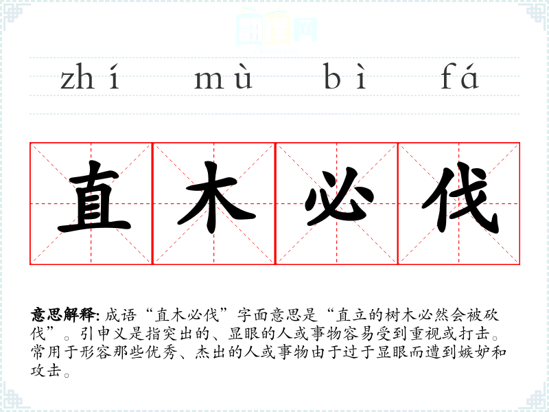 成语“直木必伐”字面意思是“直立的树木必然会被砍伐”。引申义是指突出的、显眼的人或事物容易受到重视或打击。常用于形容那些优秀、杰出的人或事物由于过于显眼而遭到嫉妒和攻击。