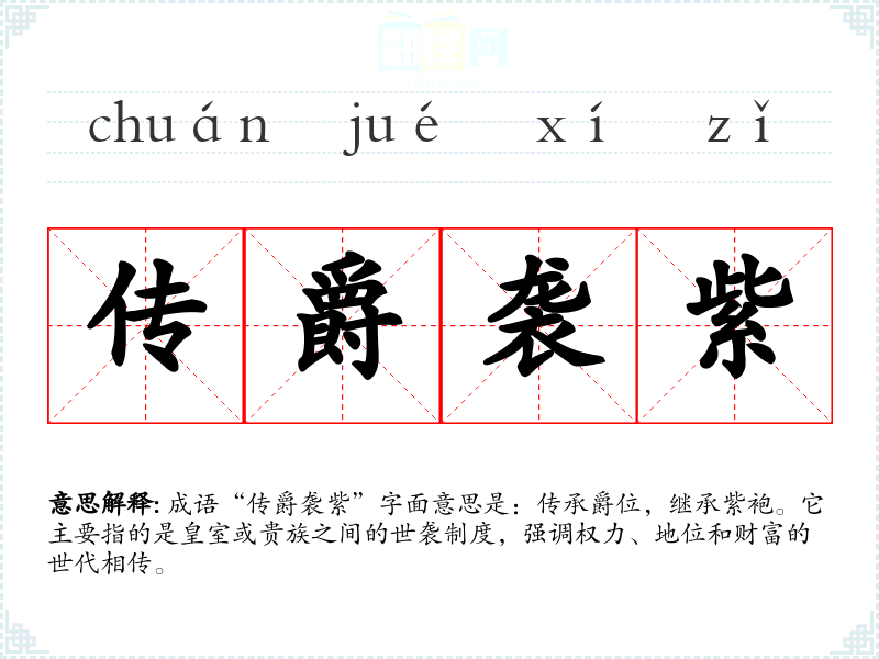 成语“传爵袭紫”字面意思是:传承爵位,继承紫袍。它主要指的是皇室或贵族之间的世袭制度,强调权力、地位和财富的世代相传。