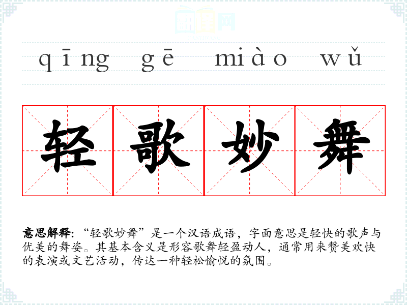 在**传统文化中,歌舞艺术是重要的娱乐形式,象征着人们对美好生活的向往。成语“轻歌妙舞”传达了人们对轻松愉快生活的追求,适用于现代社会的各种庆祝活动中,仍然具有广泛的适用性和共鸣。