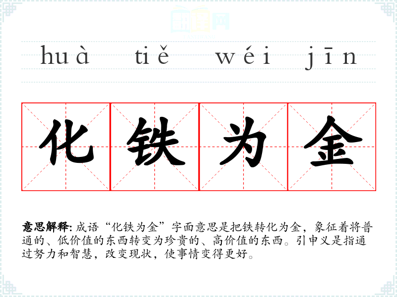成语“化铁为金”字面意思是把铁转化为金,象征着将普通的、低价值的东西转变为珍贵的、高价值的东西。引申义是指通过努力和智慧,改变现状,使事情变得更好。
