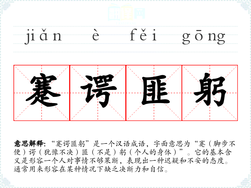 “蹇谔匪躬”是一个汉语成语,字面意思为“蹇(脚步不便)谔(犹豫不决)匪(不是)躬(个人的身体)”。它的基本含义是形容一个人对事情不够果断,表现出一种迟疑和不安的态度。通常用来形容在某种情况下缺乏决断力和自信。