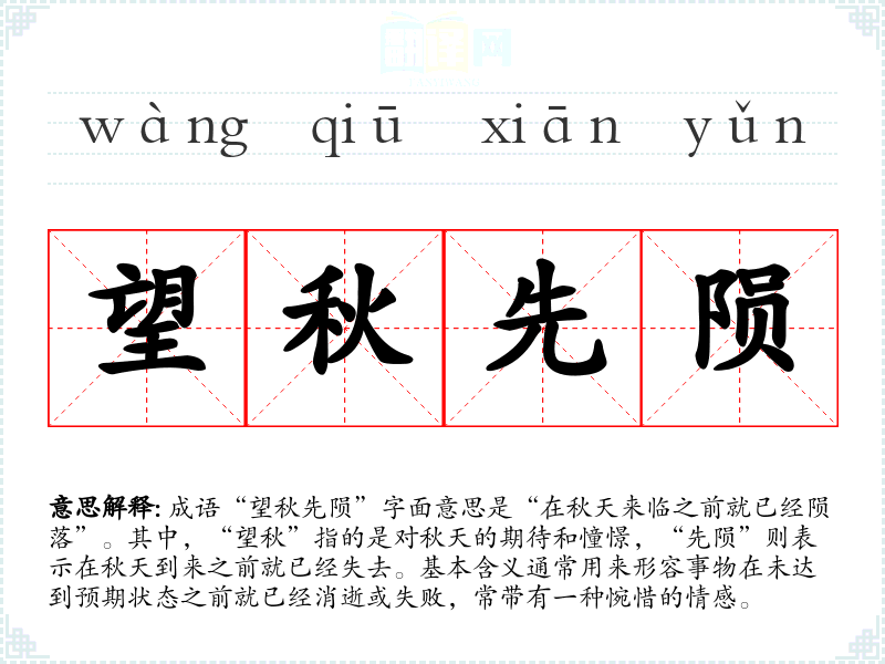 成语“望秋先陨”字面意思是“在秋天来临之前就已经陨落”。其中,“望秋”指的是对秋天的期待和憧憬,“先陨”则表示在秋天到来之前就已经失去。基本含义通常用来形容事物在未达到预期状态之前就已经消逝或失败,常带有一种惋惜的情感。
