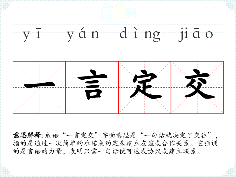 成语“一言定交”字面意思是“一句话就决定了交往”,指的是通过一次简单的承诺或约定来建立友谊或合作关系。它强调的是言语的力量,表明只需一句话便可达成协议或建立联系。