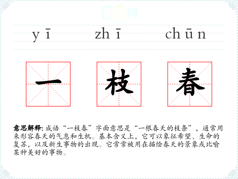 成语“一枝春”字面意思是“一根春天的枝条”,通常用来形容春天的气息和生机。基本含义上,它可以象征希望、生命的复苏,以及新生事物的出现。它常常被用在描绘春天的景象或比喻某种美好的事物。