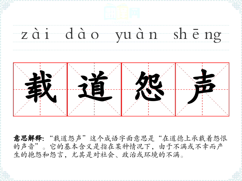 “载道怨声”这个成语字面意思是“在道德上承载着怨恨的声音”。它的基本含义是指在某种情况下,由于不满或不幸而产生的抱怨和怨言,尤其是对社会、政治或环境的不满。