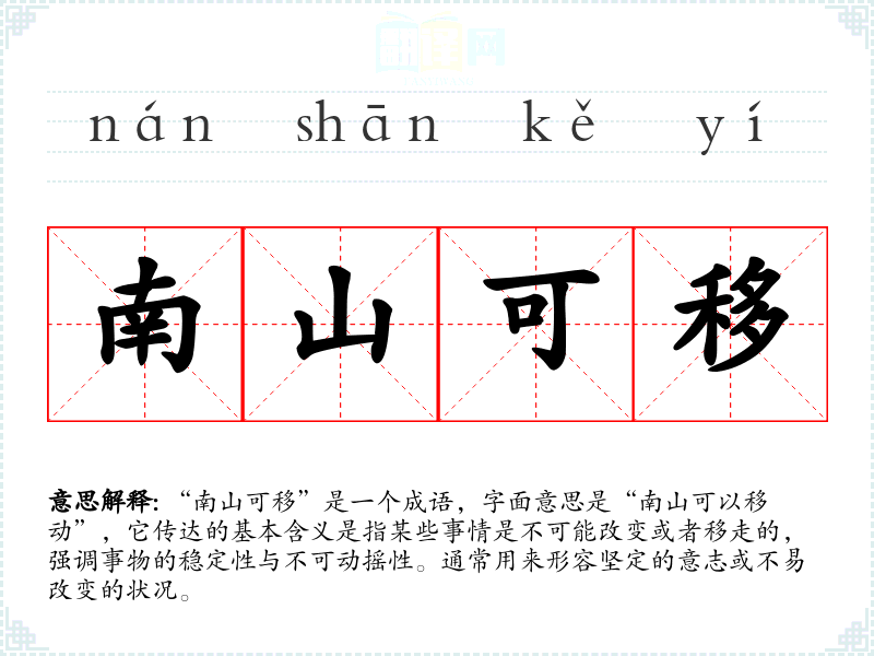 在英语中,与“南山可移”相似的表达可能是“set in stone”,意指某事已被确定,不可更改。这反映出不同文化中对坚持和不变的相似理解。